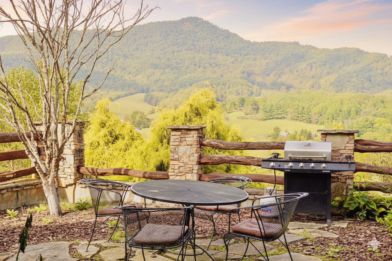 Grill and chill with a view! This outdoor grilling area offers the perfect setting for a barbecue with breathtaking mountain scenery.