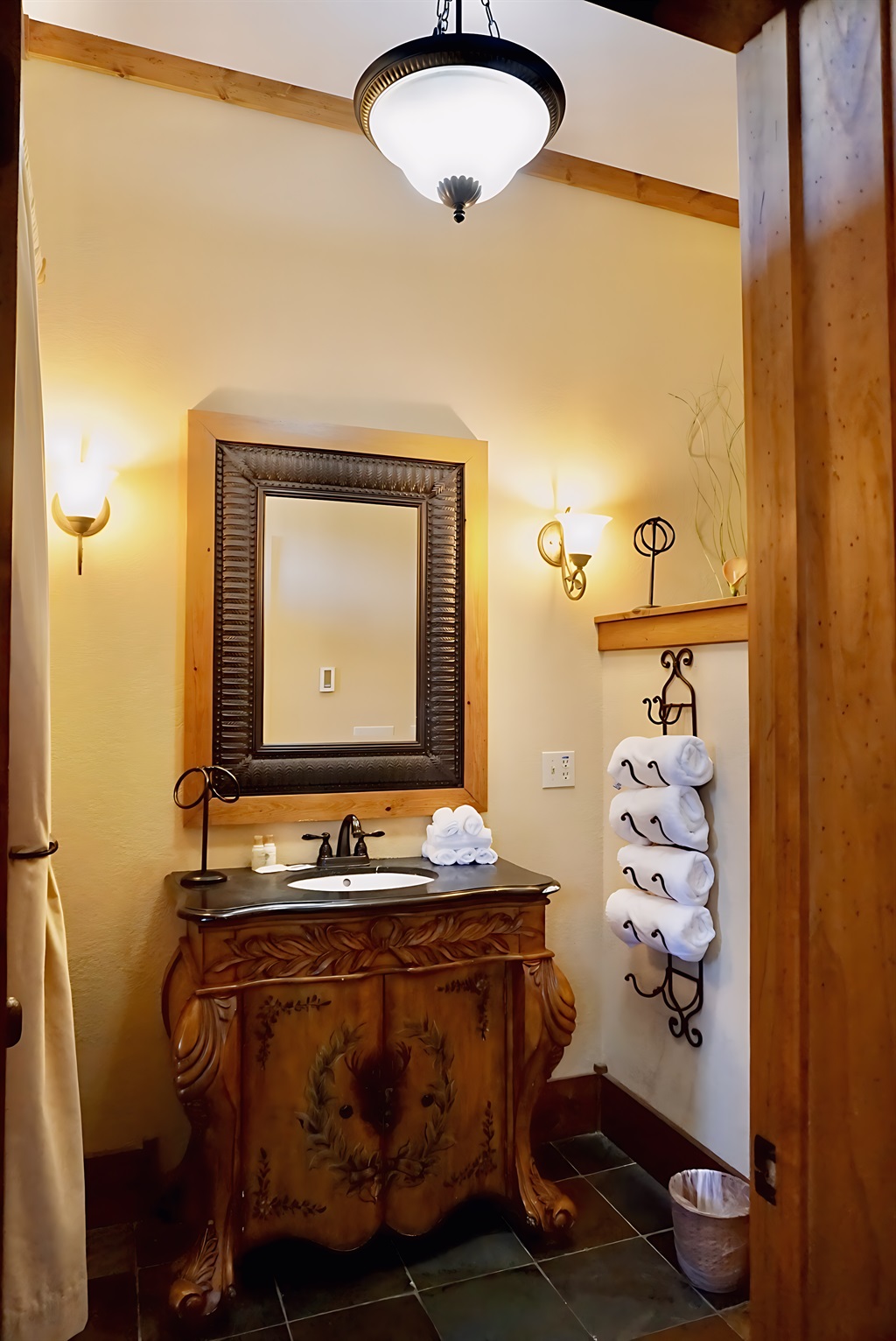 Pamper yourself! This elegant bathroom offers a relaxing retreat after a day of adventure.