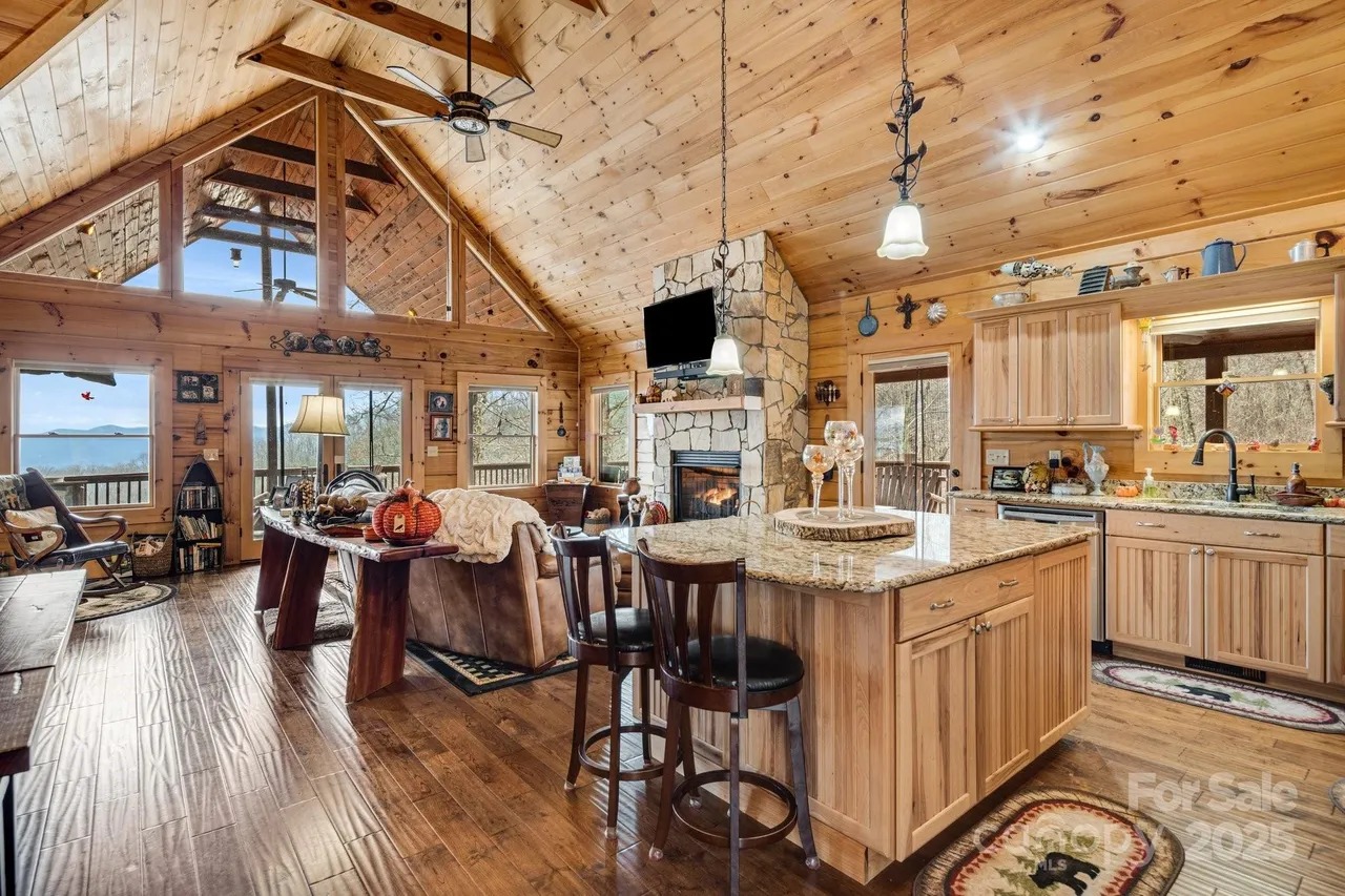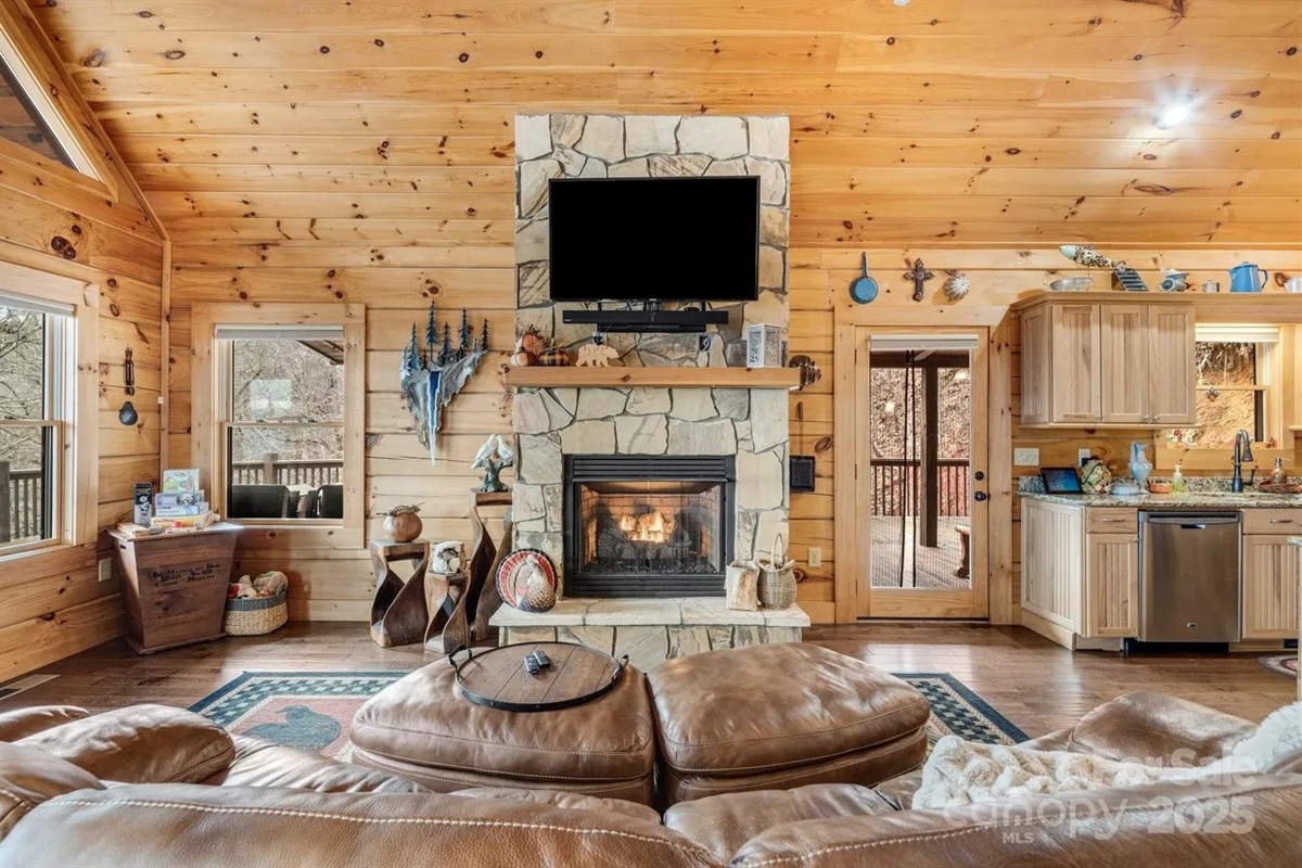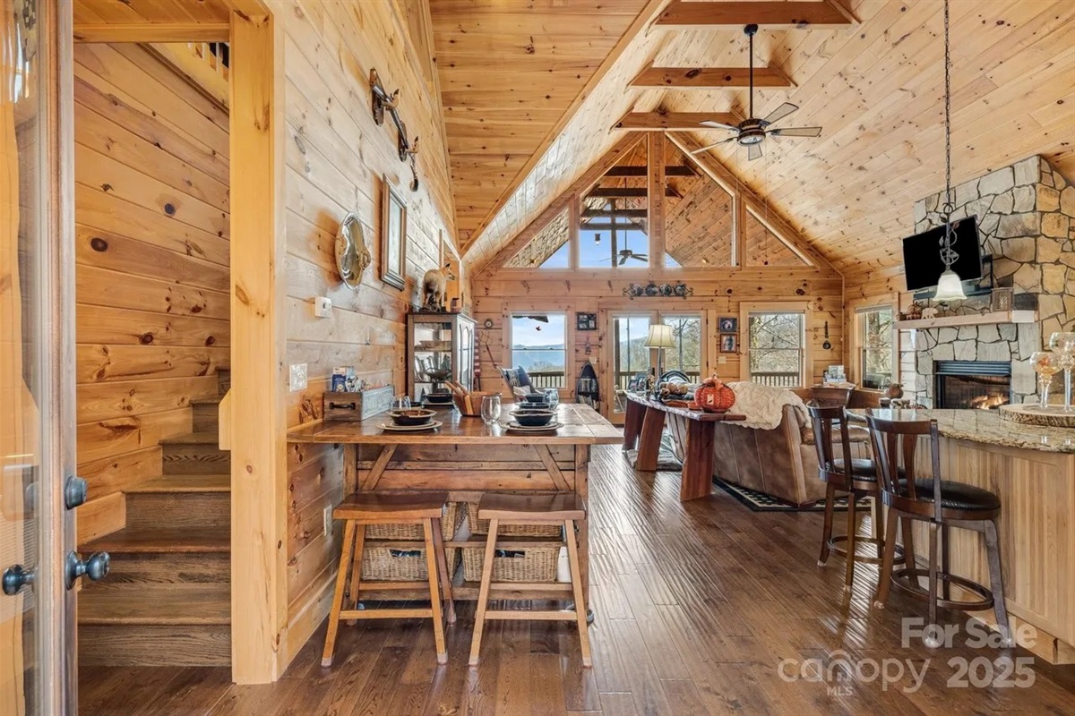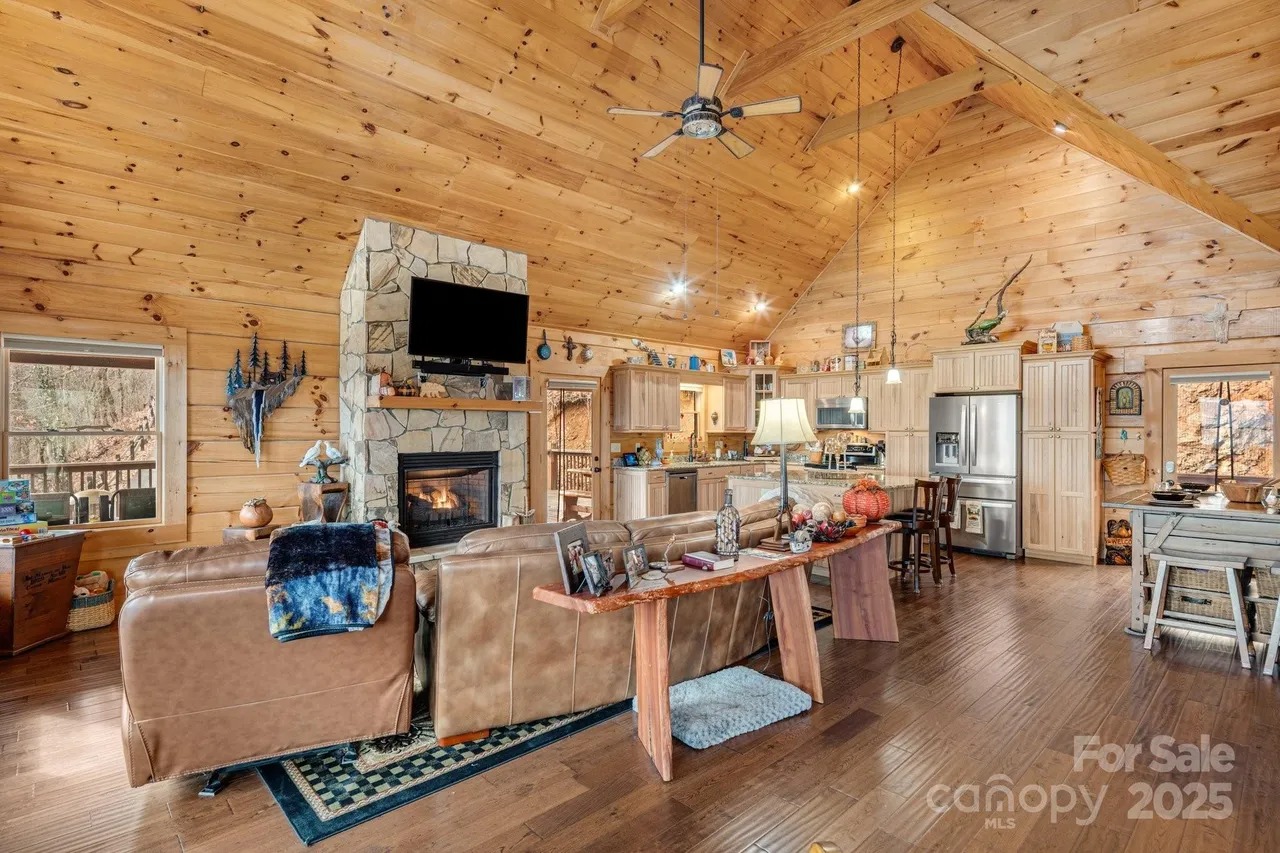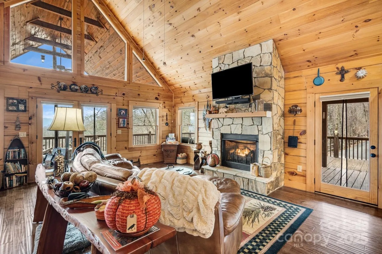 🛋️ Cozy living area with vaulted ceilings and a stone fireplace