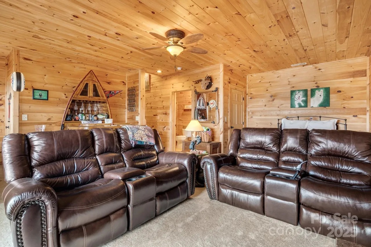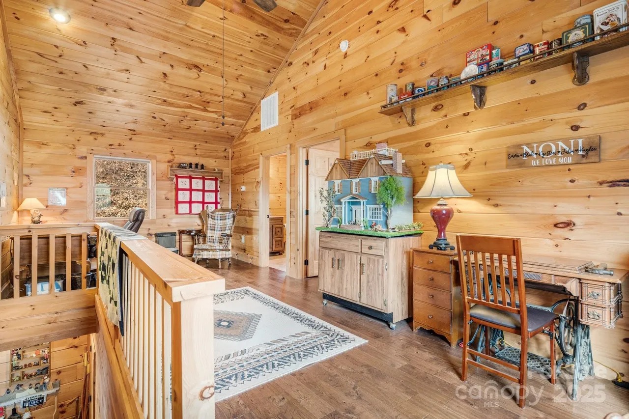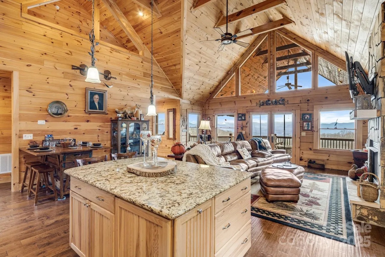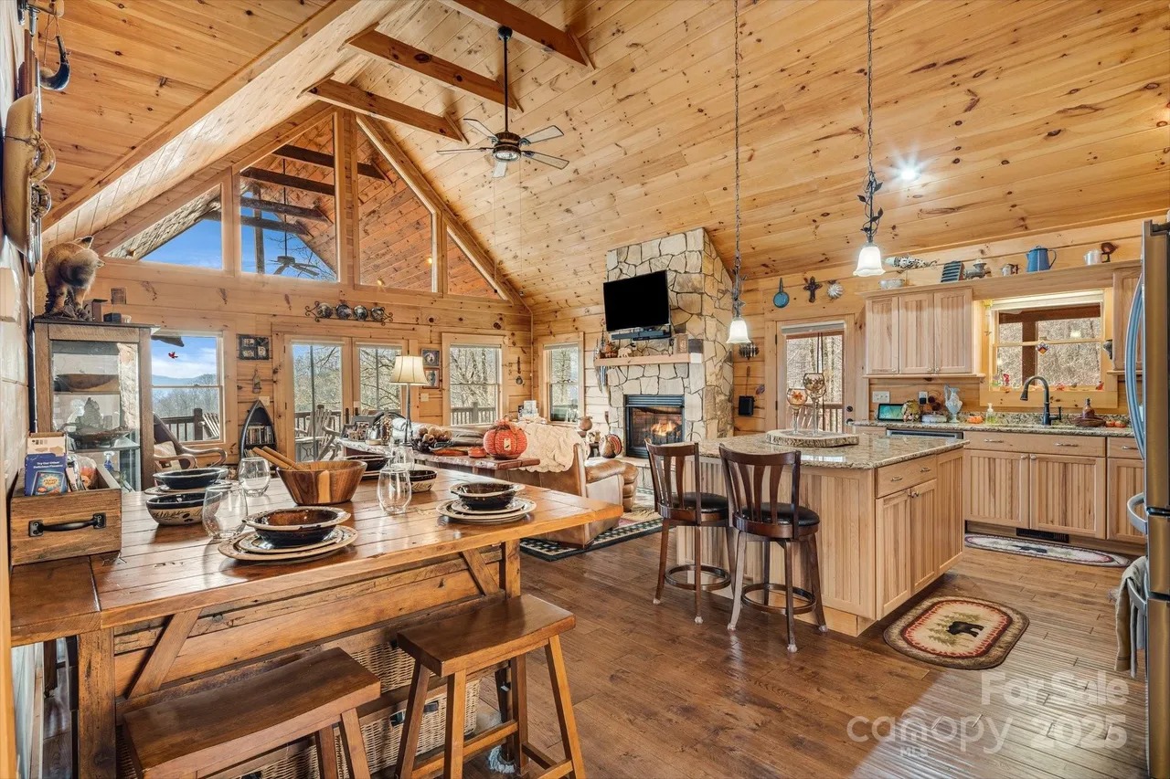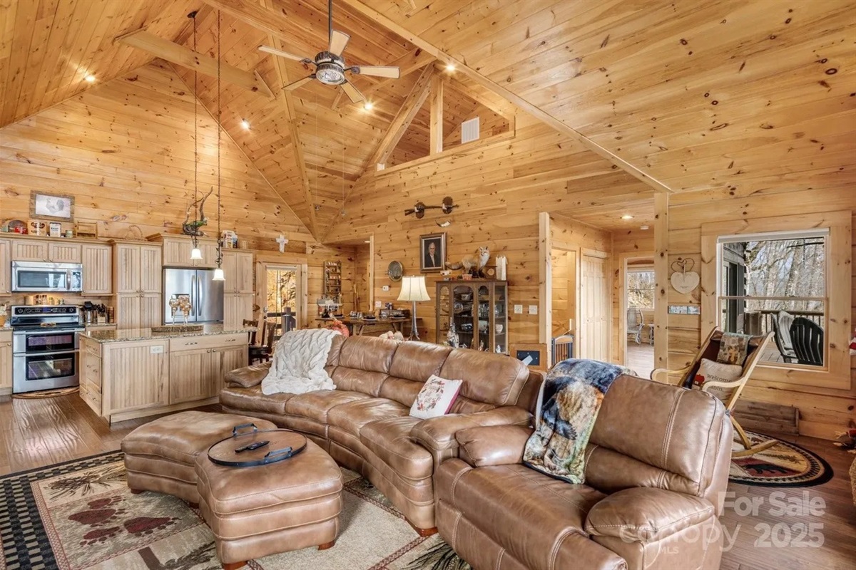 🛋️ Cozy living area with vaulted ceilings and a stone fireplace
